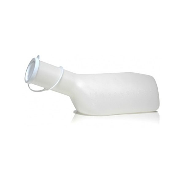 nádoba na moč pro pány s uzávěrem, bezpečný trojhranný tvar, provedení mléčné, obsah se stupnicí 1000 ml