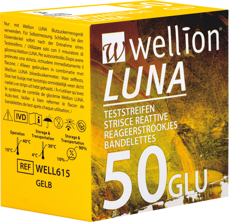 Testovací proužky Wellion jsou učené pro použití s přístrojem Wellion LUNA TRIO a slouží k měření hladiny cukru v krvi. Proužky jsou vyrobené z několika různých vrstvev obsahujících elektrody, které byly na proužek naneseny speciální technologií. Biologický substrát – oxidáza glukózy – je umístěn v reakční zóně testovacího proužku, a velmi specifickým způsobem reaguje s glukózou obsaženou v krvi. Během této reakce je generován elektrický proud, který je přepočítán a zobrazen na displeji přístroje jako obsah cukru v krvi. Konec testovacího proužku, který nasává kapku krve do reakční zóny, je dostatečně vzdálen od samotného přístroje, čímž se zabrání potřísnění přístroje.
