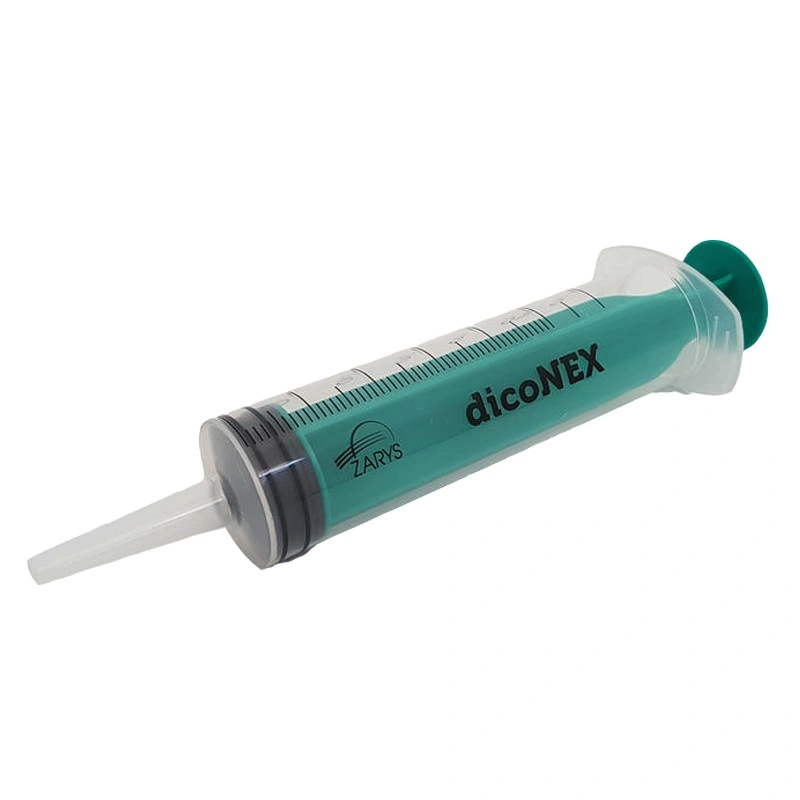 Třídílná injekční stříkačka Zarys dicoNEX představuje výplachovou stříkačku pro katetr. Transparentní barva válce s dobře čitelnou stupnicí a zeleným pístem umožňují vizuální kontrolu obsahu a jeho dávkování. Určeno k jednorázovému použití. Sterilní.